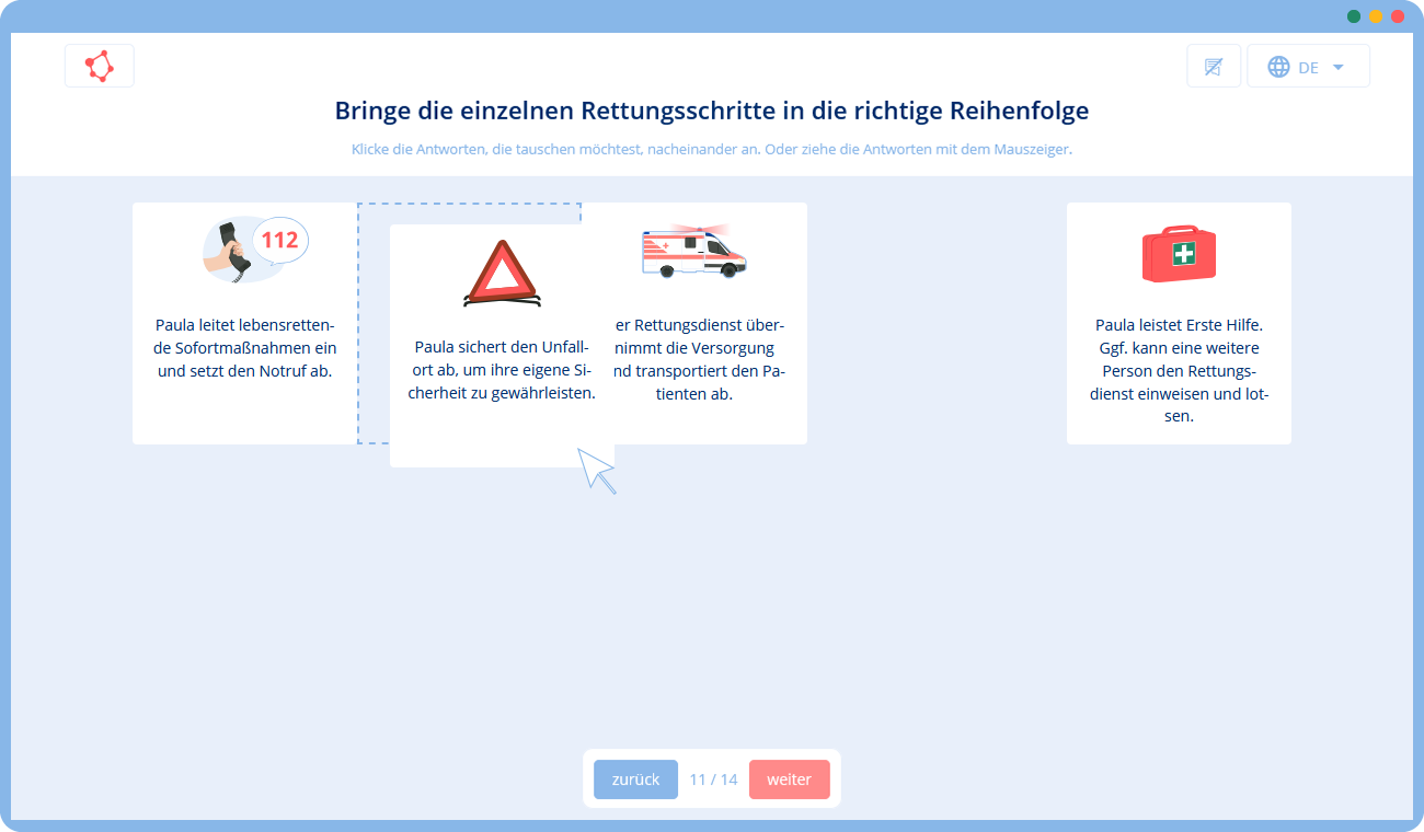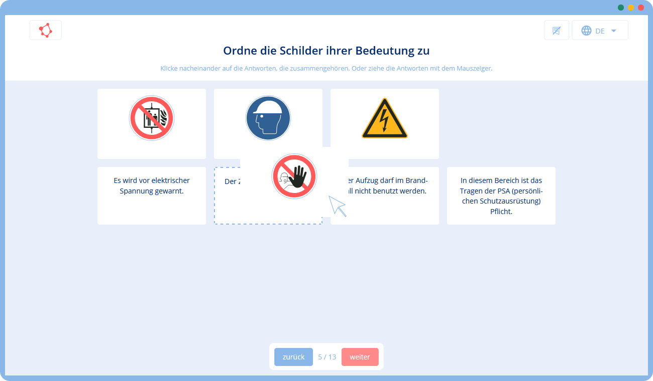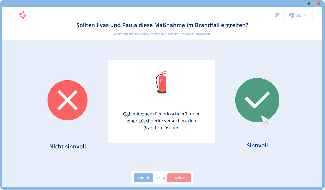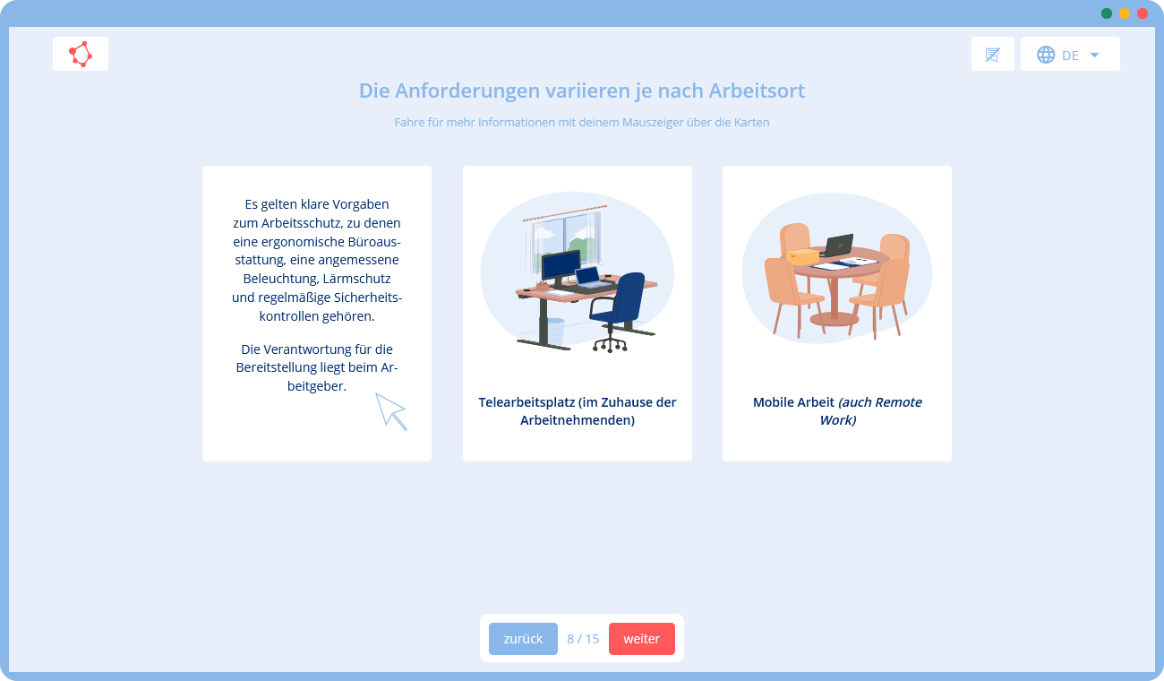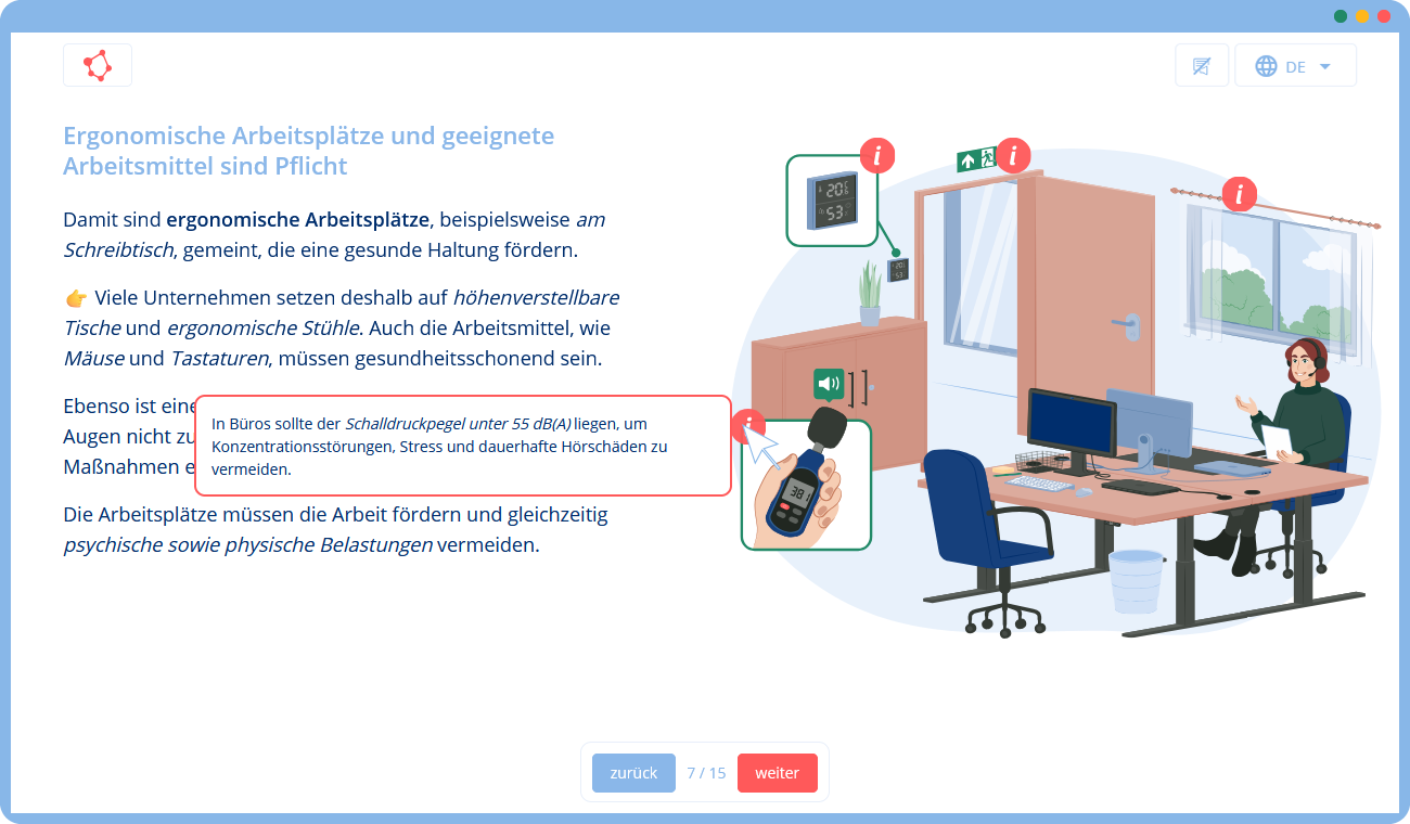 Unsere Lösung ist daher ein interaktives Online-Training, das die Grundlagen des Arbeitsschutzes im Büro vermittelt: