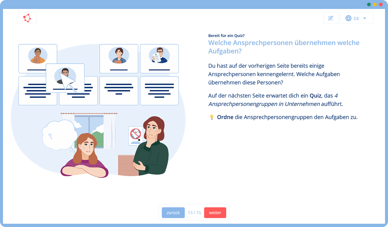 Das Training ist modular aufgebaut. Es kann jederzeit unterbrochen und später fortgesetzt werden. Am Ende steht ein Quiz.