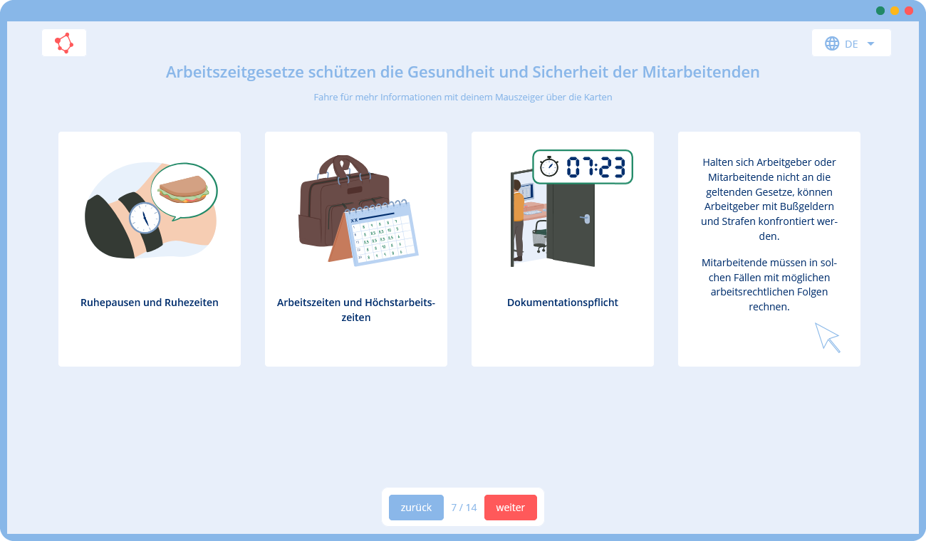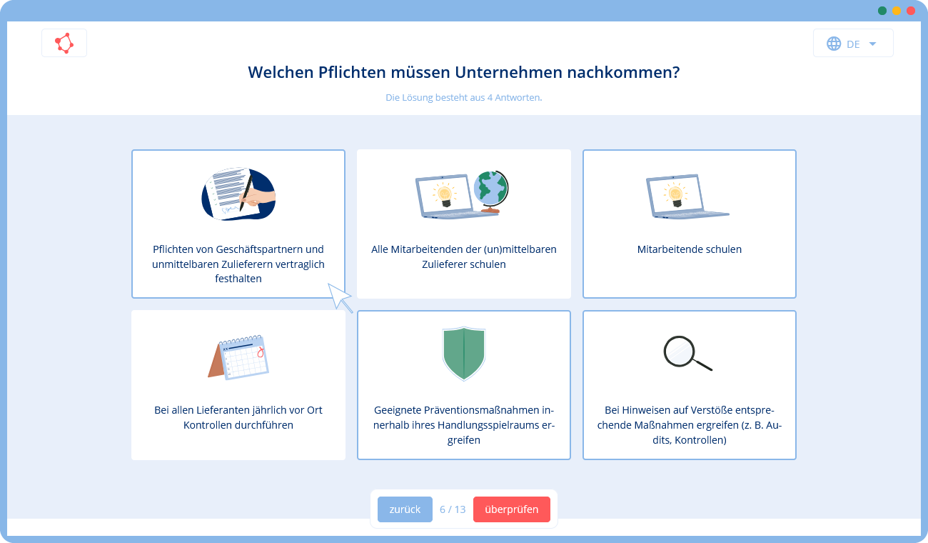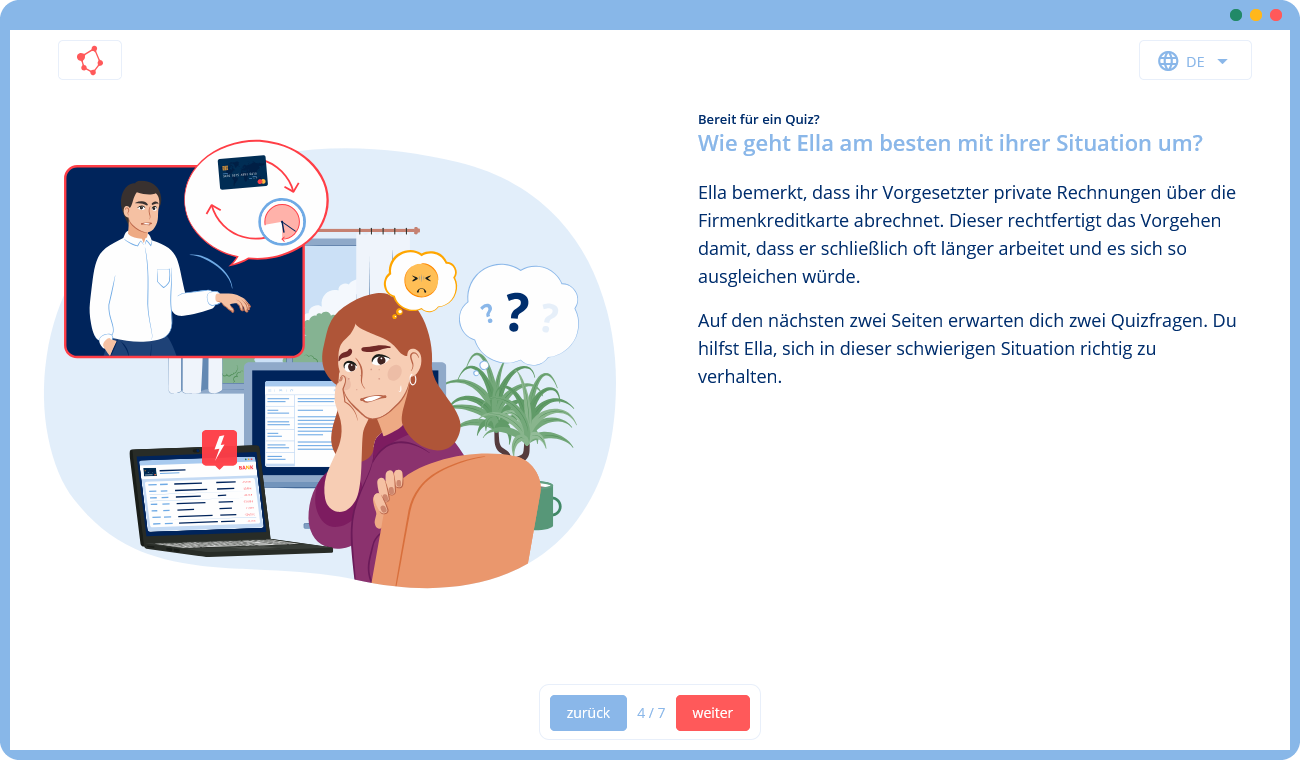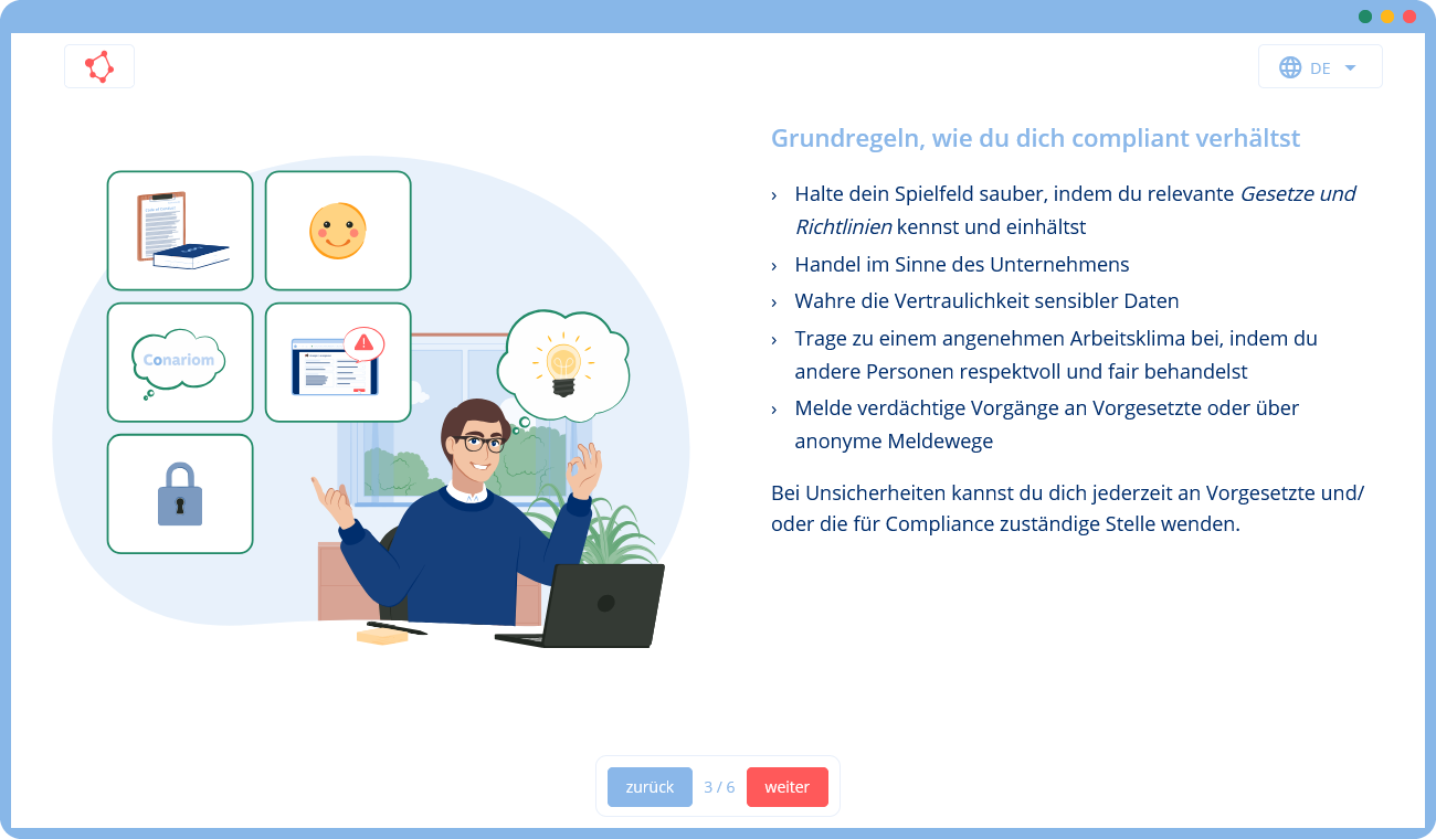 Unsere Lösung ist daher ein interaktives Online-Training, das die Grundlagen der Compliance auf verständliche Weise vermittelt: