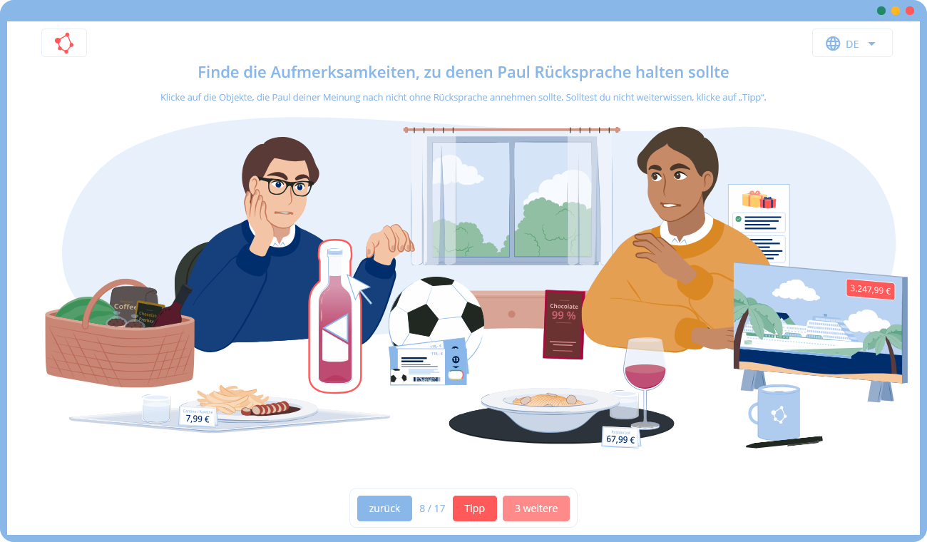 Das Training ist praxisnah, kurzweilig und führt mit den wiederkehrenden Figuren Paul, Paula, Ella und Ilyas, die durch typische Situationen – ohne Paragrafenflut.