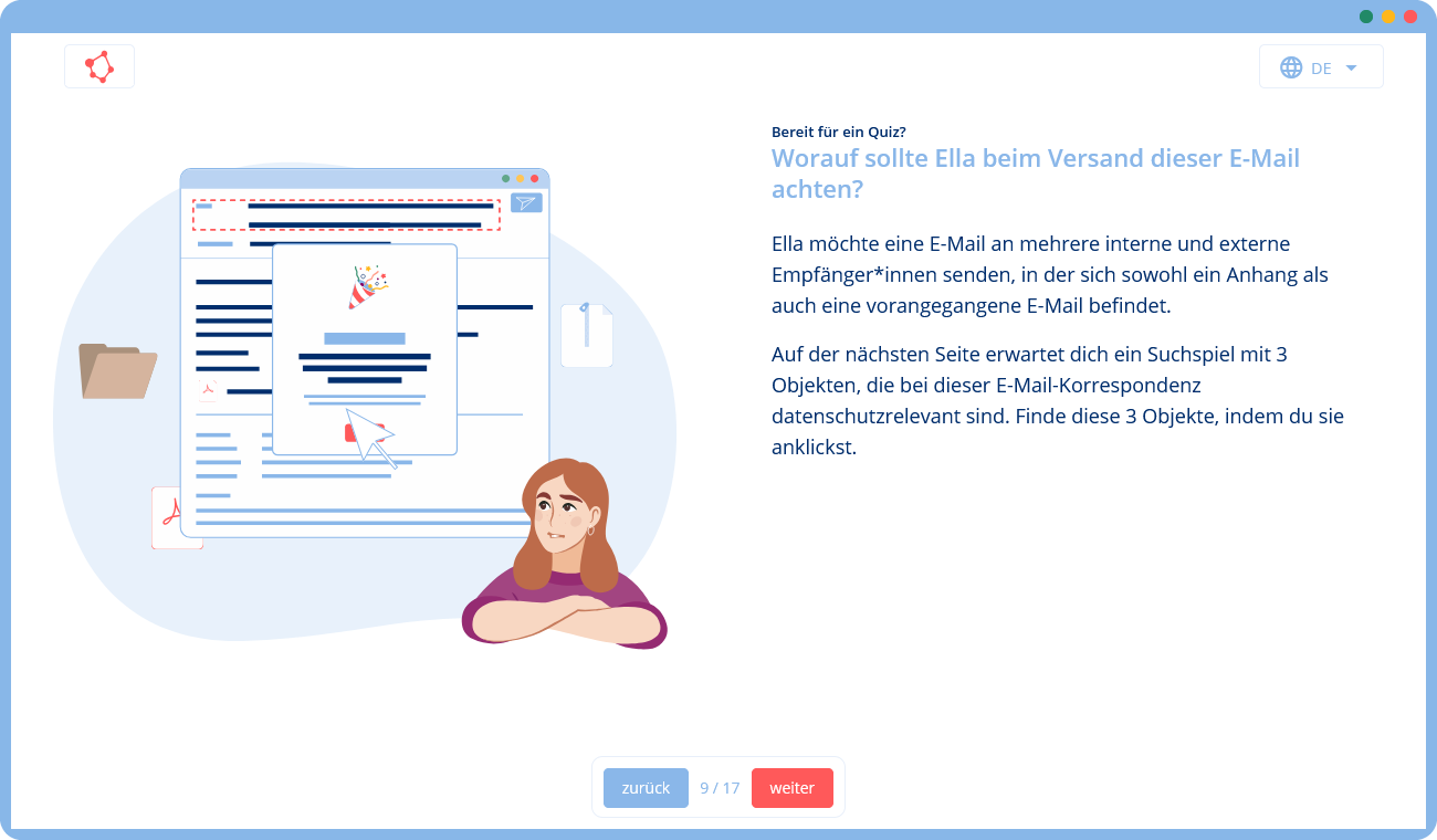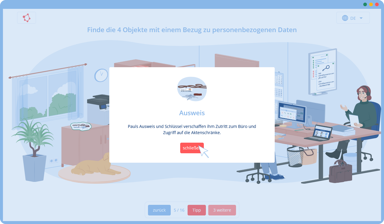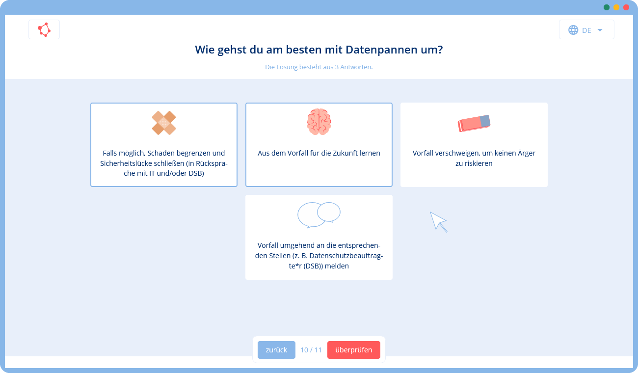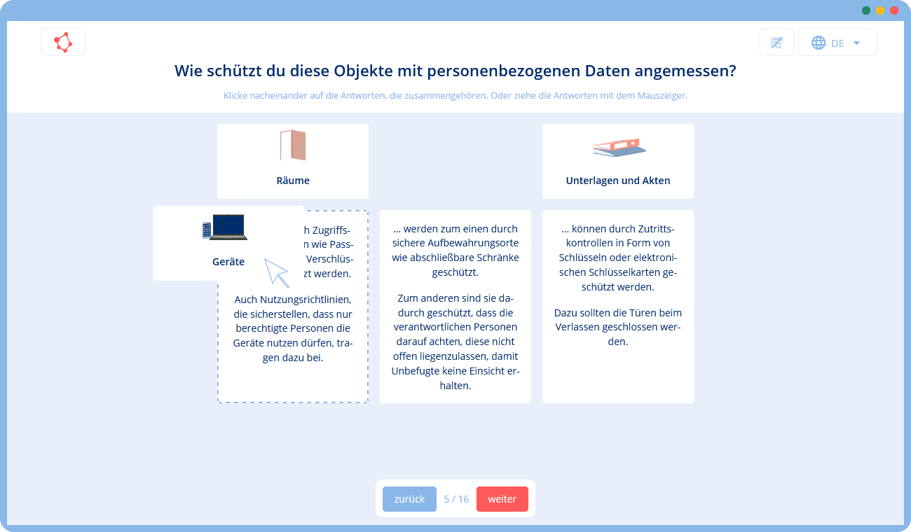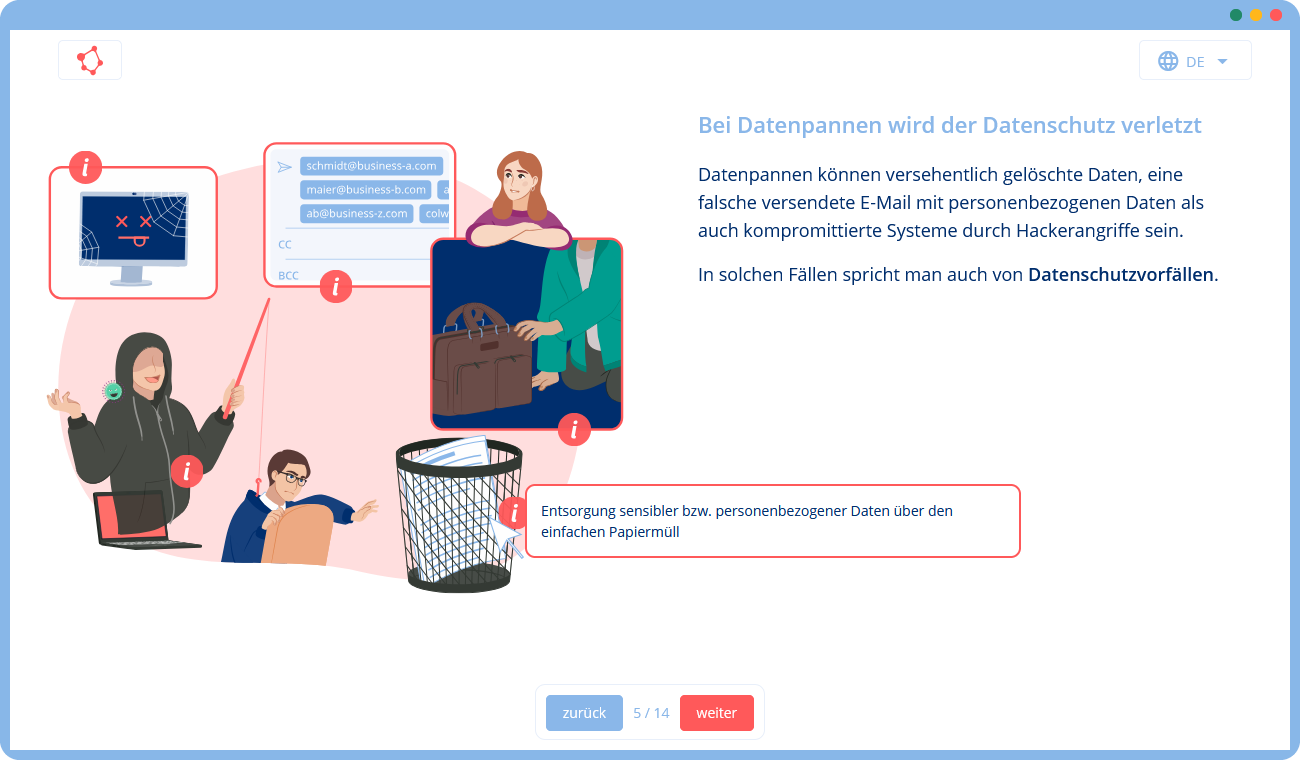 Unsere Lösung ist daher ein interaktives Online-Training, das die Grundlagen des Datenschutzes ohne spezielle Anforderungen vermittelt: