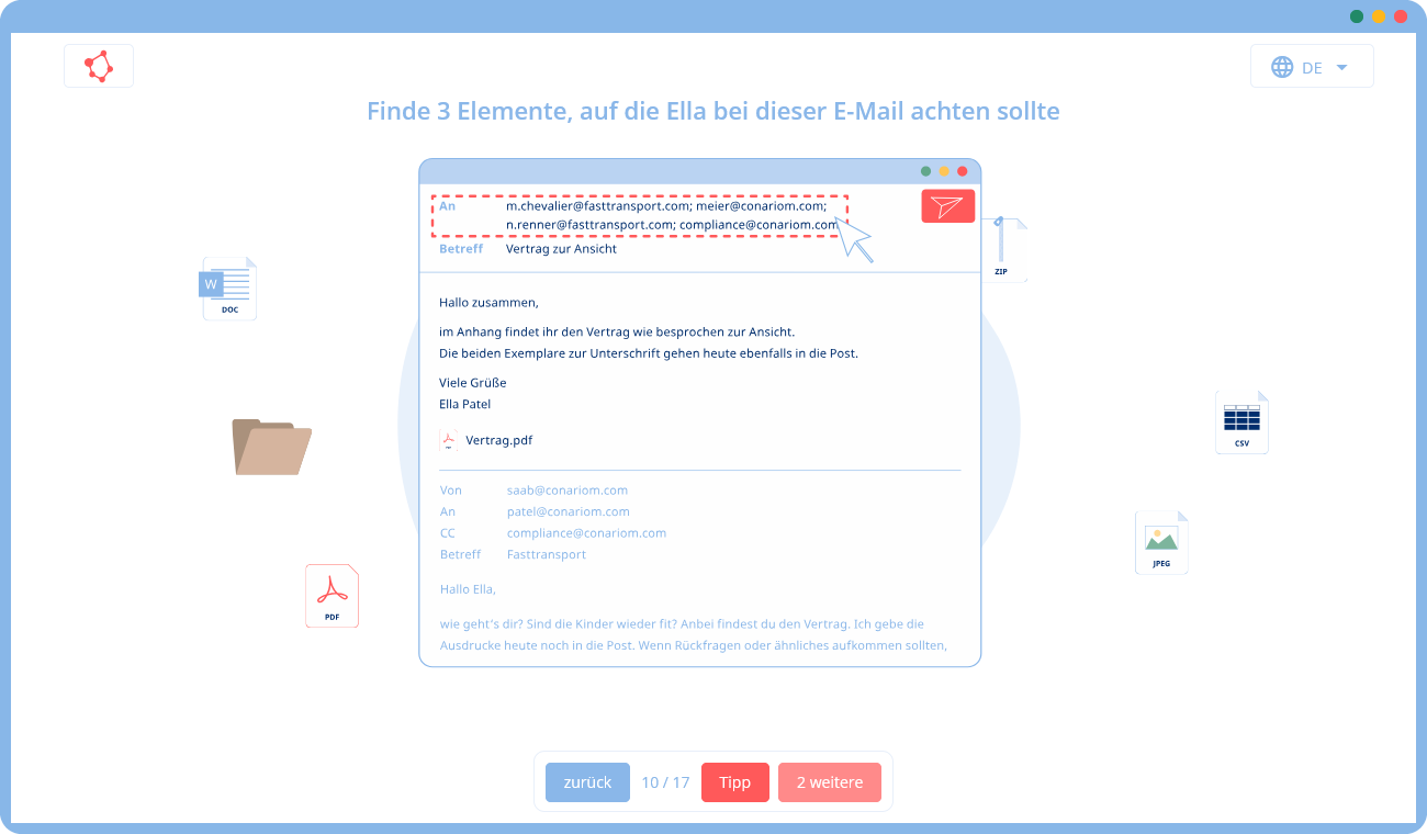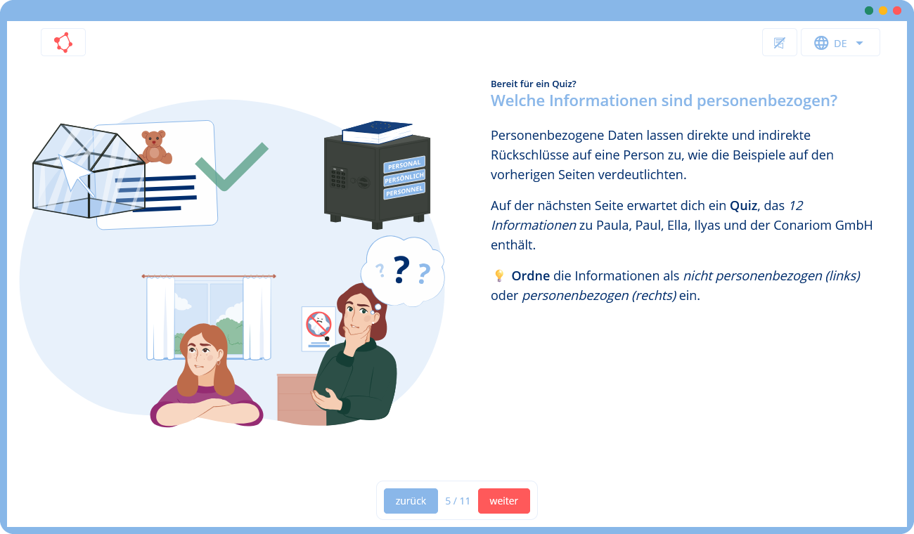 Die Teilnehmenden begleiten Paula, Paul, Ella und Ilyas durch das Training im fiktiven Unternehmen Conariom. Dabei lernen sie, wie diese in ihrer täglichen Arbeit personenbezogene Daten schützen und datenschutzkonform verarbeiten.