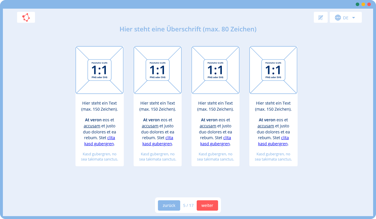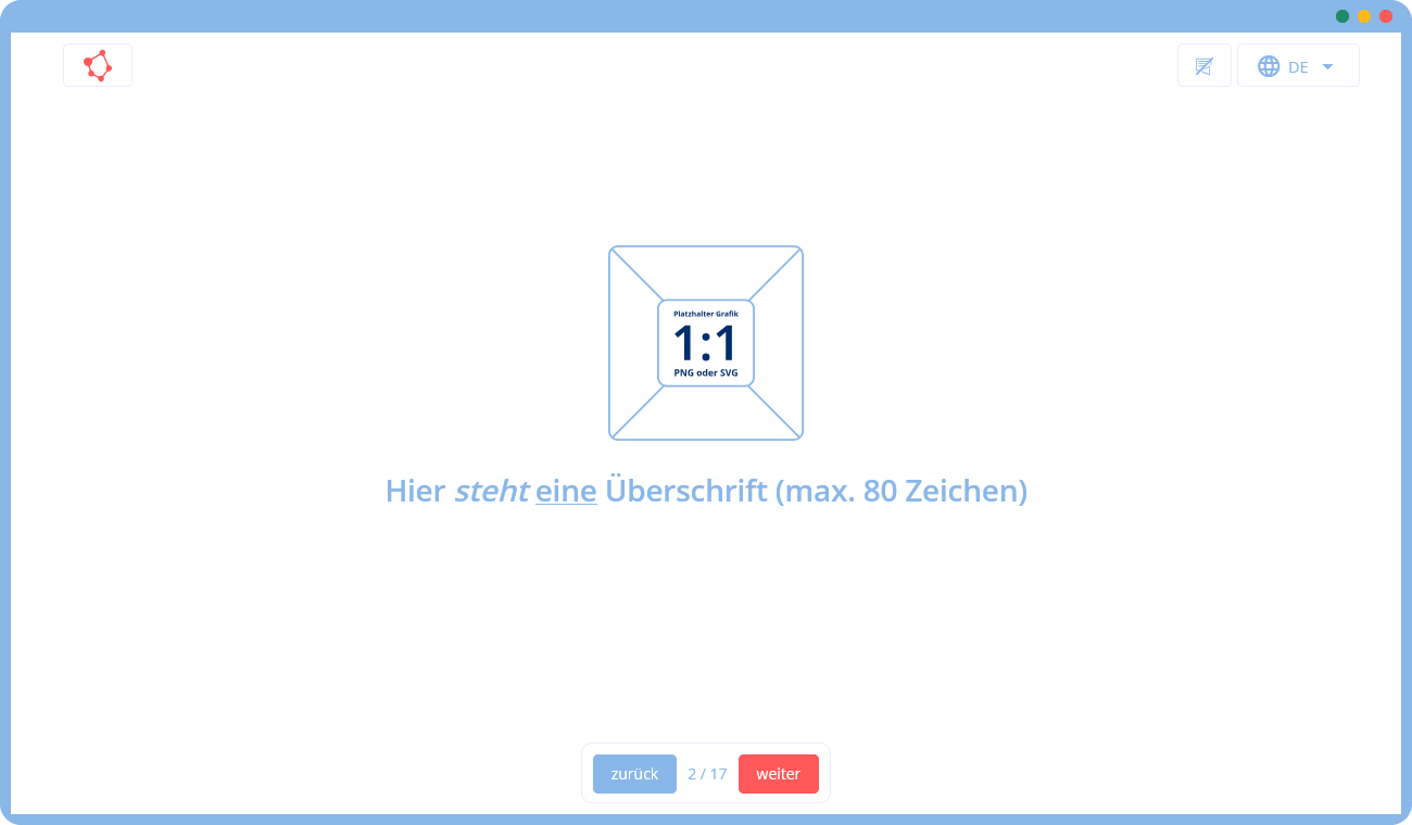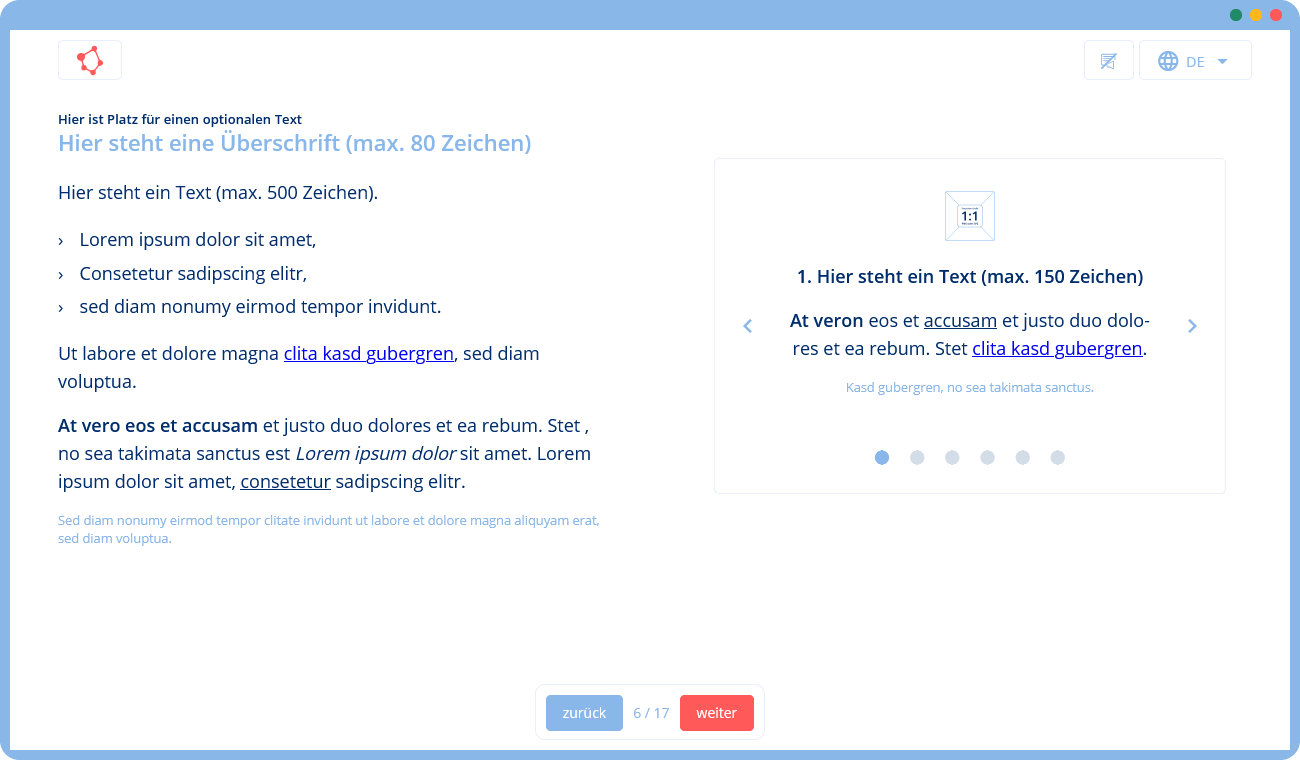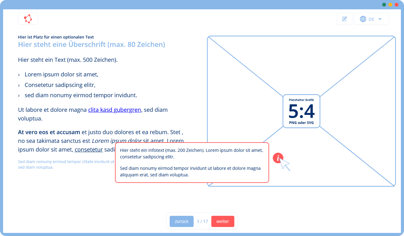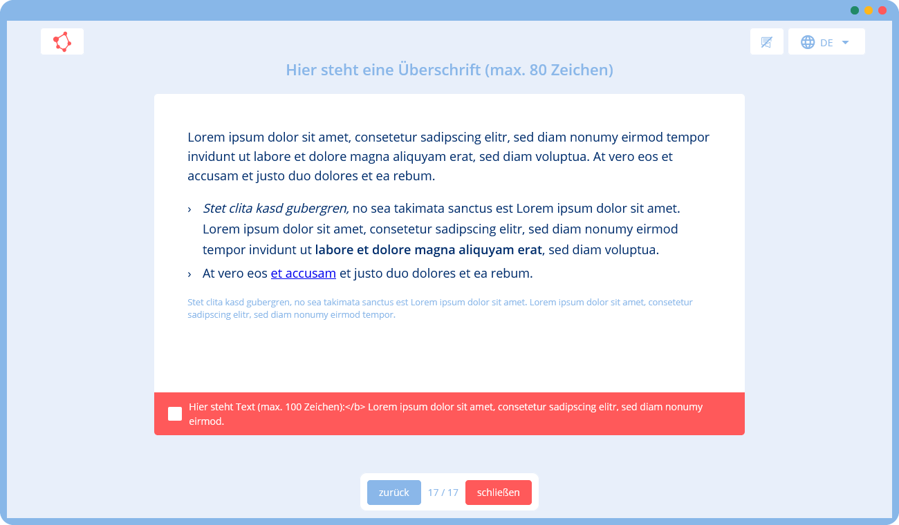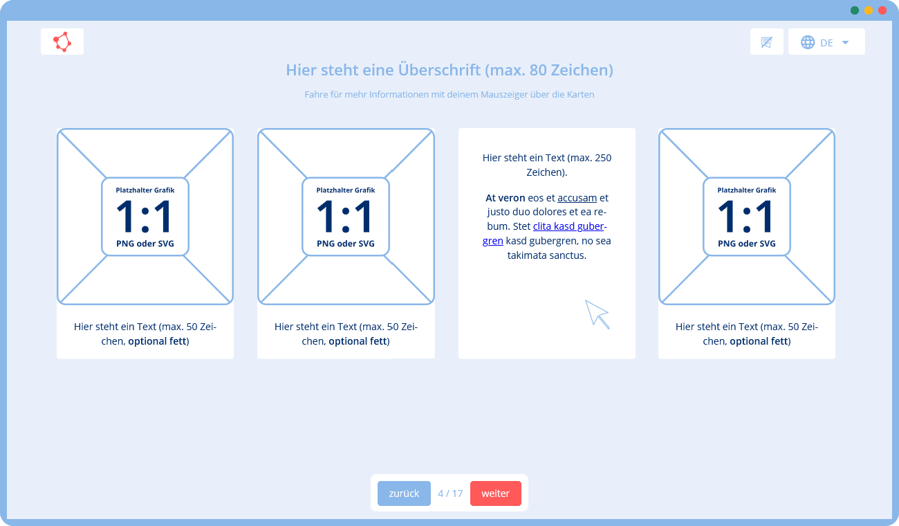 🛠 Du gibst uns eine Vorlage mit Texten und Bildern (z. B. in Form einer Präsentation), die wir mithilfe unserer Templates in ein Training umsetzen. Falls du zusätzliche Texte oder Grafiken benötigst, können wir diese für dich erstellen.
