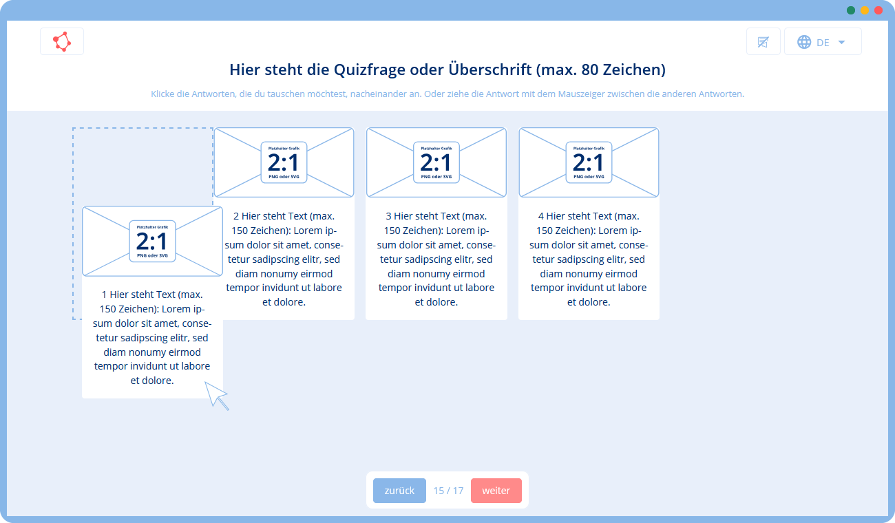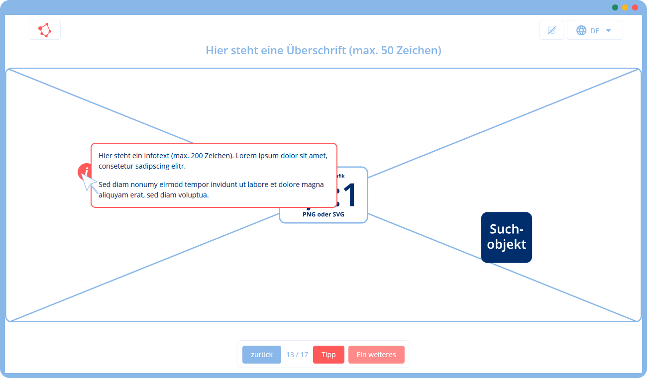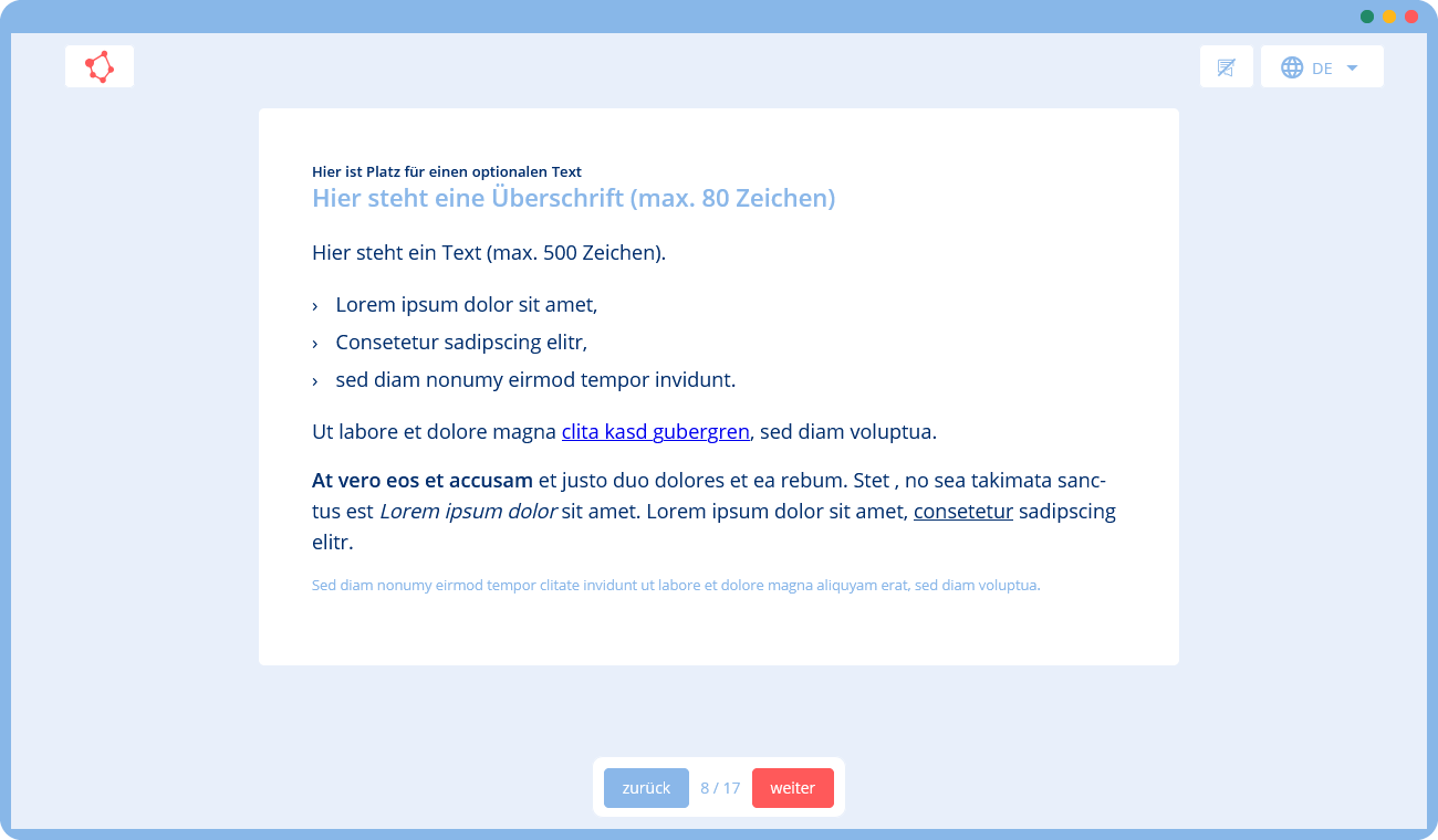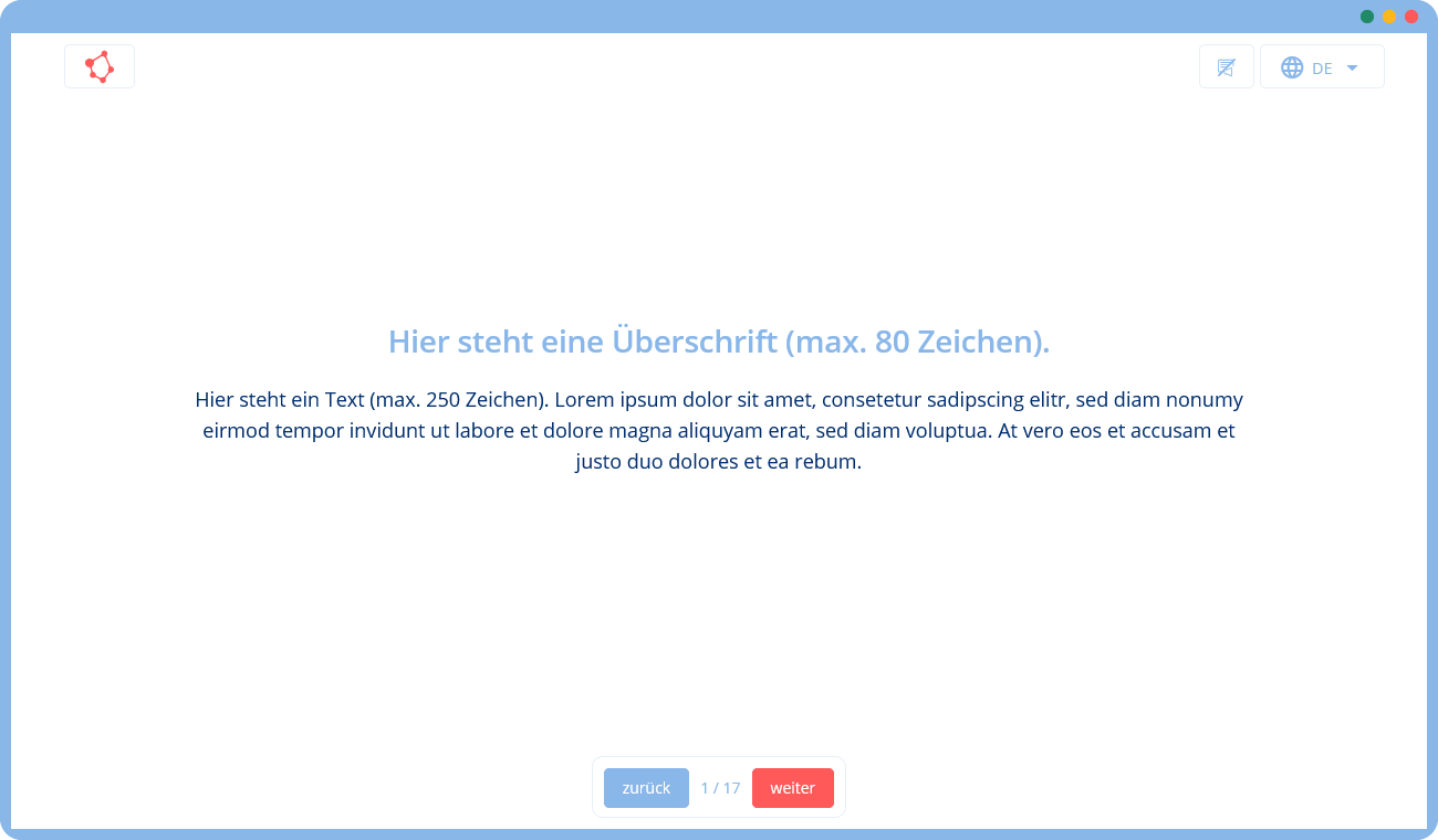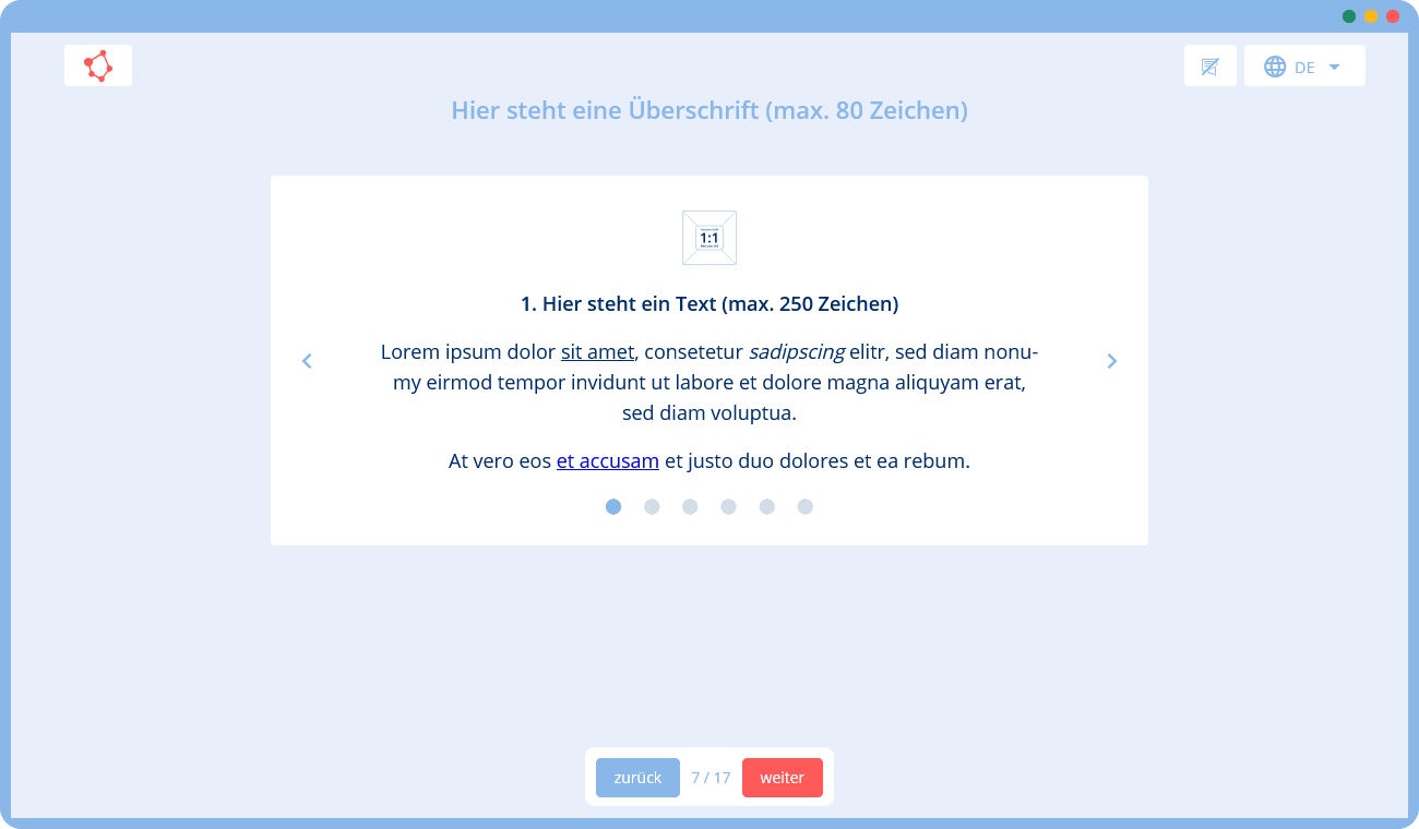 🛠 Du gibst uns eine Vorlage mit Texten und Bildern (z. B. in Form einer Präsentation), die wir mithilfe unserer Templates in ein Training umsetzen. Falls du zusätzliche Texte oder Grafiken benötigst, können wir diese für dich erstellen.
