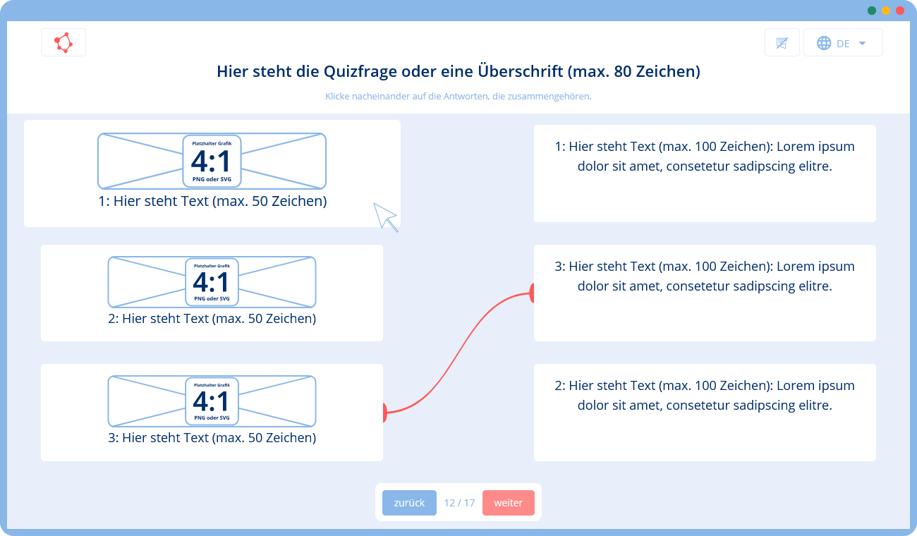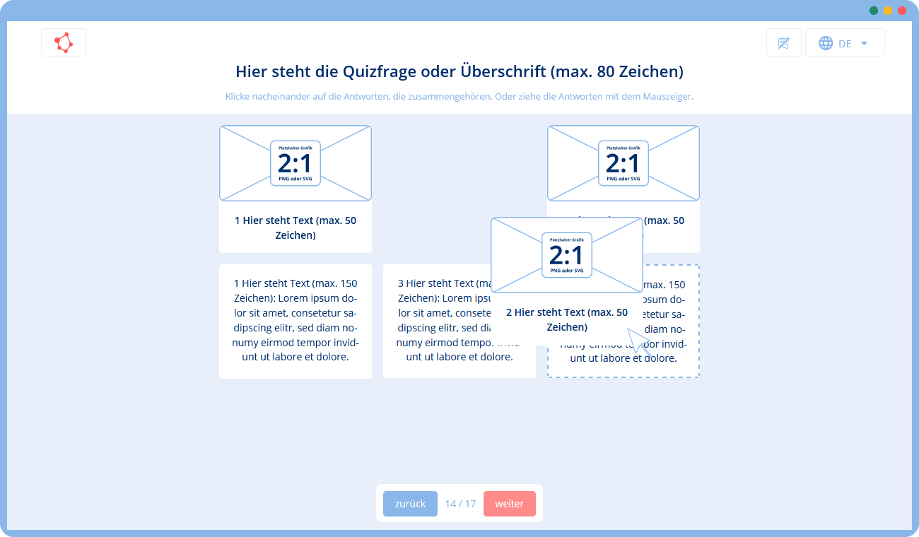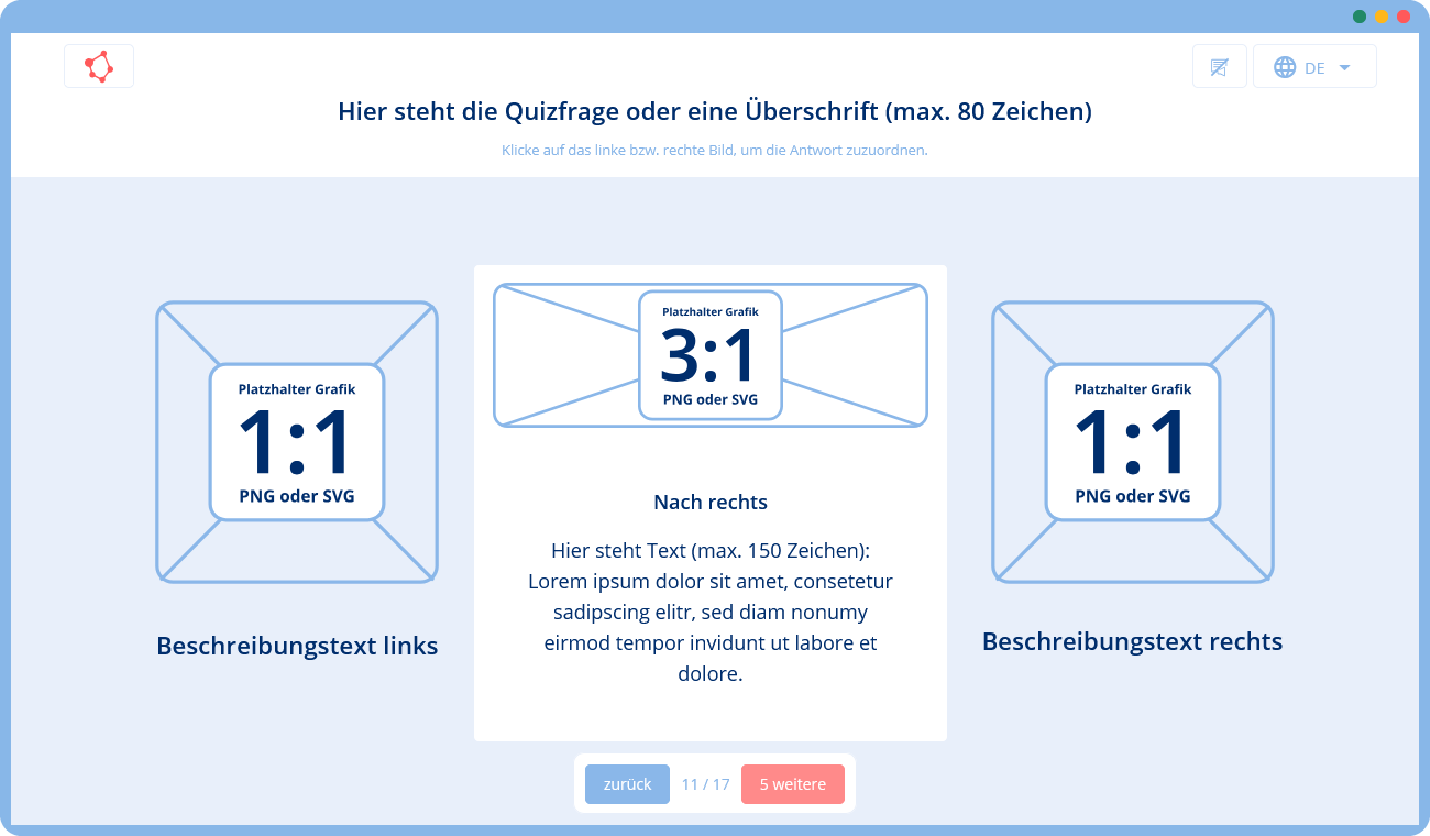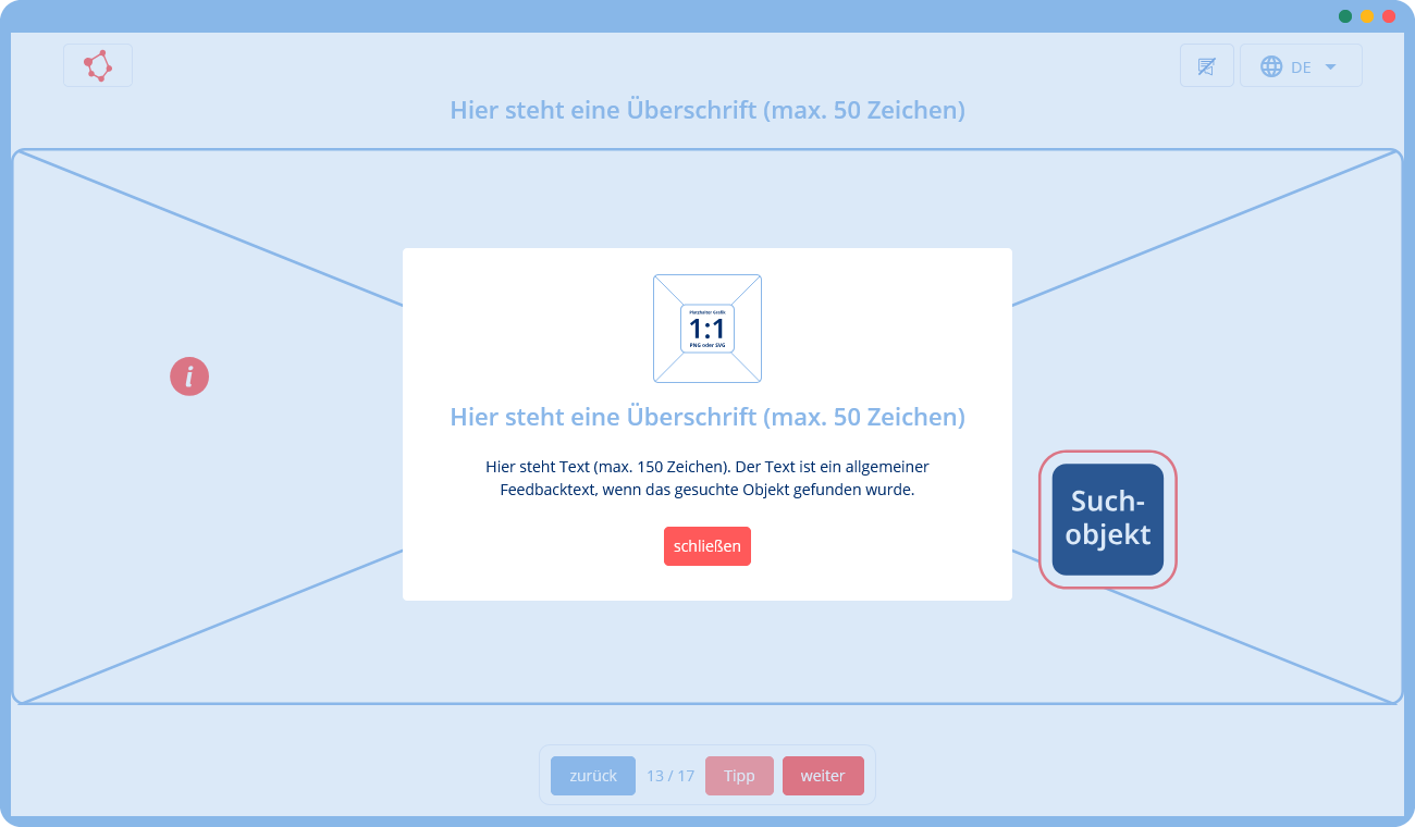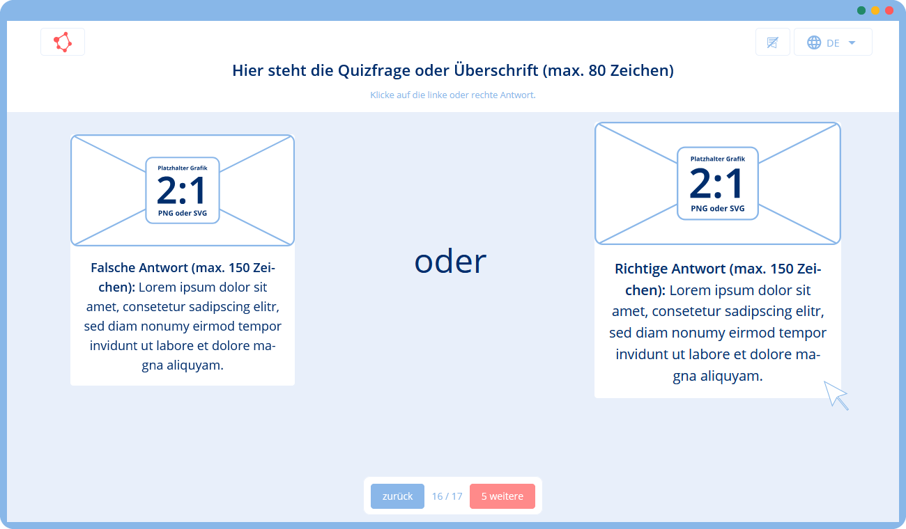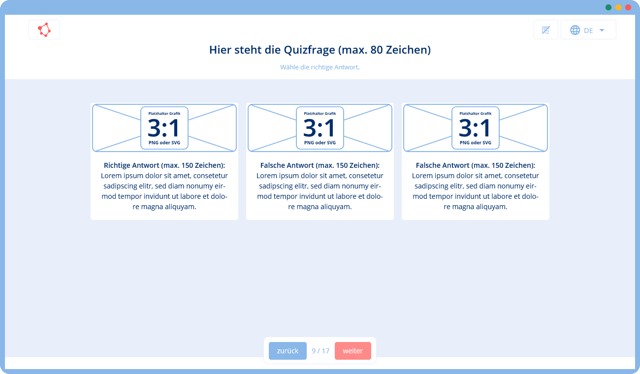 🛠 Du gibst uns eine Vorlage mit Texten und Bildern (z. B. in Form einer Präsentation), die wir mithilfe unserer Templates in ein Training umsetzen. Falls du zusätzliche Texte oder Grafiken benötigst, können wir diese für dich erstellen.